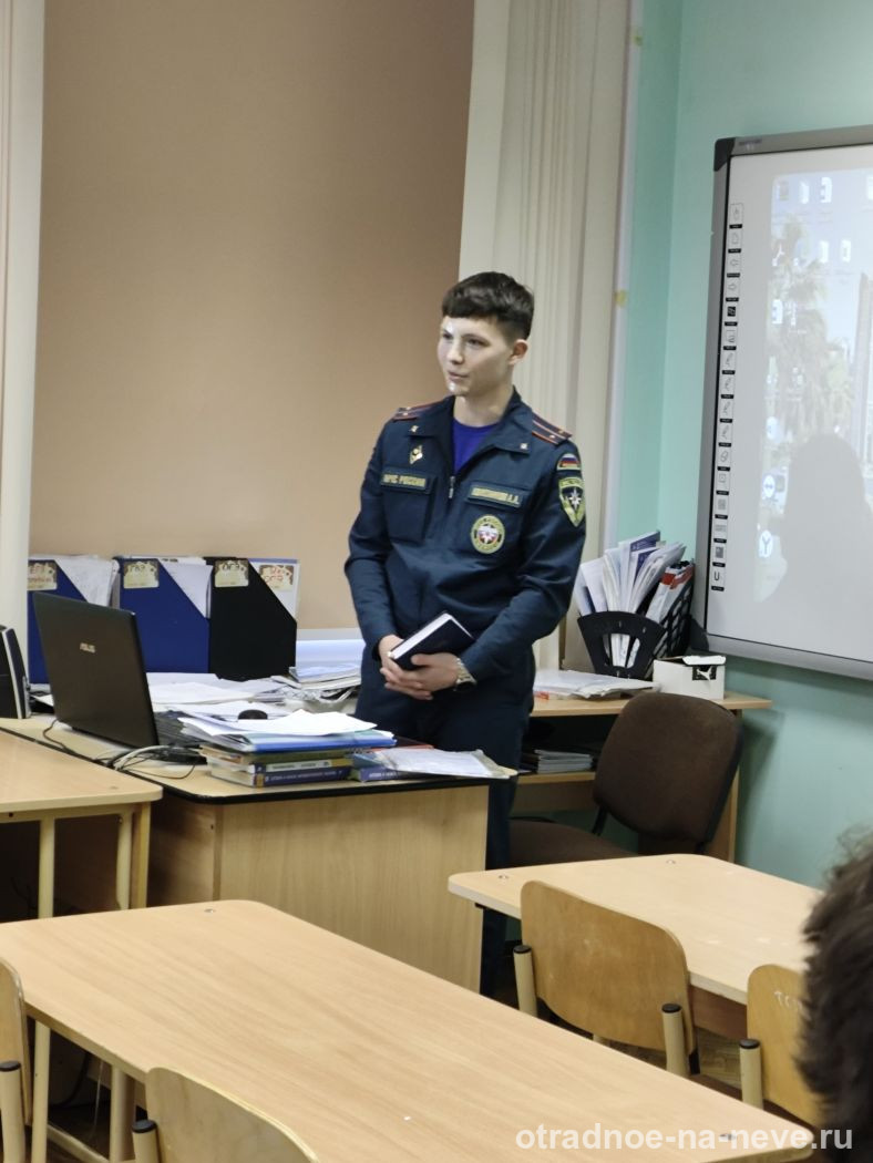 дознаватель отдела надзорной деятельности и профилактической работы Кировского района УНД и ПР ГУ МЧС России по Ленинградской области Колесников А.А.: «Поступление в образовательные организации МЧС России» в 11 классе;