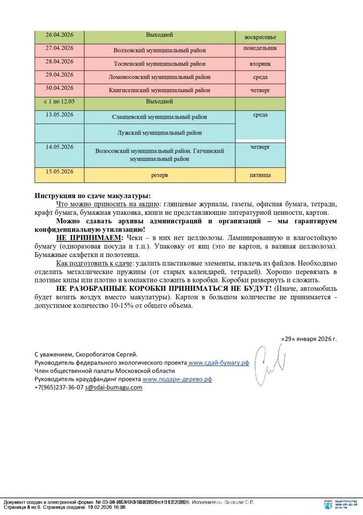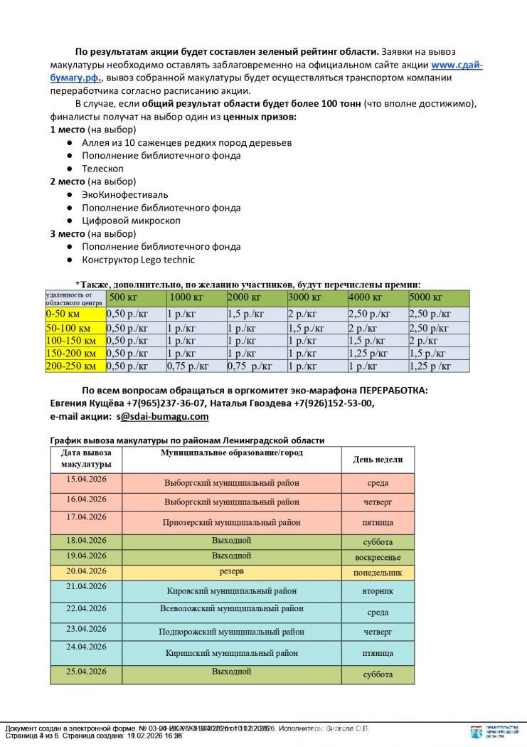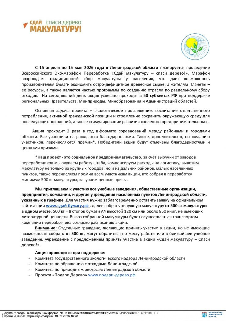 Следующая акция “Сдай макулатуру — спаси дерево!” в выбранных районах Ленинградской области планируется с 15 апреля по 15 мая 2026 года. Принять участие в эко-марафоне могут все жители, предприятия, компании, учебные заведения и общественные организации, собравшие более 500 кг макулатуры и оставившие предварительно заявку на сайте сдай-бумагу.рф. По результатам акции каждый участник эко-марафона получит грамоты и денежные премии, а победители ценные призы.