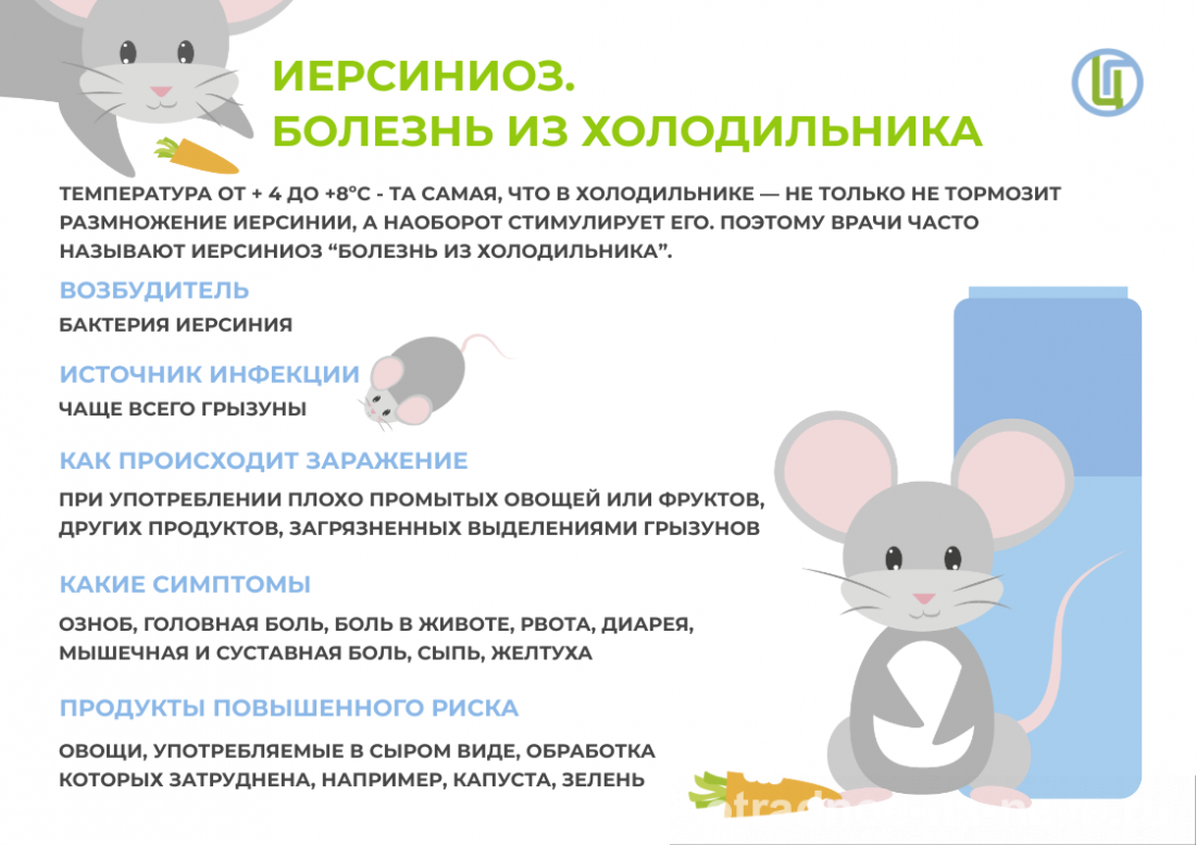 Иерсиниоз — острое инфекционное заболевание, характеризующееся поражением желудочно-кишечного тракта, общей интоксикацией, нередко кожными проявлениями, поражением печени, селезенки, суставов и других органов и систем. Источником инфекции могут быть дикие и домашние животные, но чаще всего — мыши. Они часто живут в овощехранилищах, где обсеменяют овощи возбудителями болезни. А низкая температура и высокая влажность — идеальные условия для размножения иерсинии. Иерсинии вообще не любители тепла — нагревание до 60ºC убивает их уже через полминуты, зато любой холод им нипочем — микроб выдерживает многократное замораживание и оттаивание.