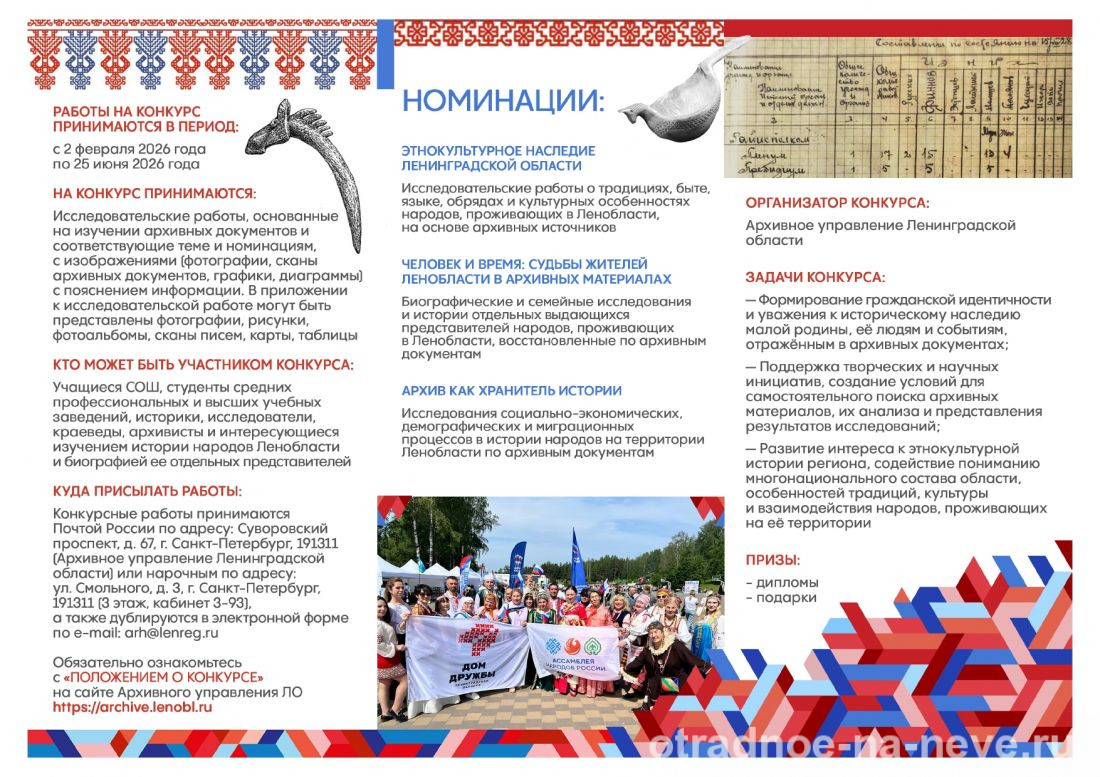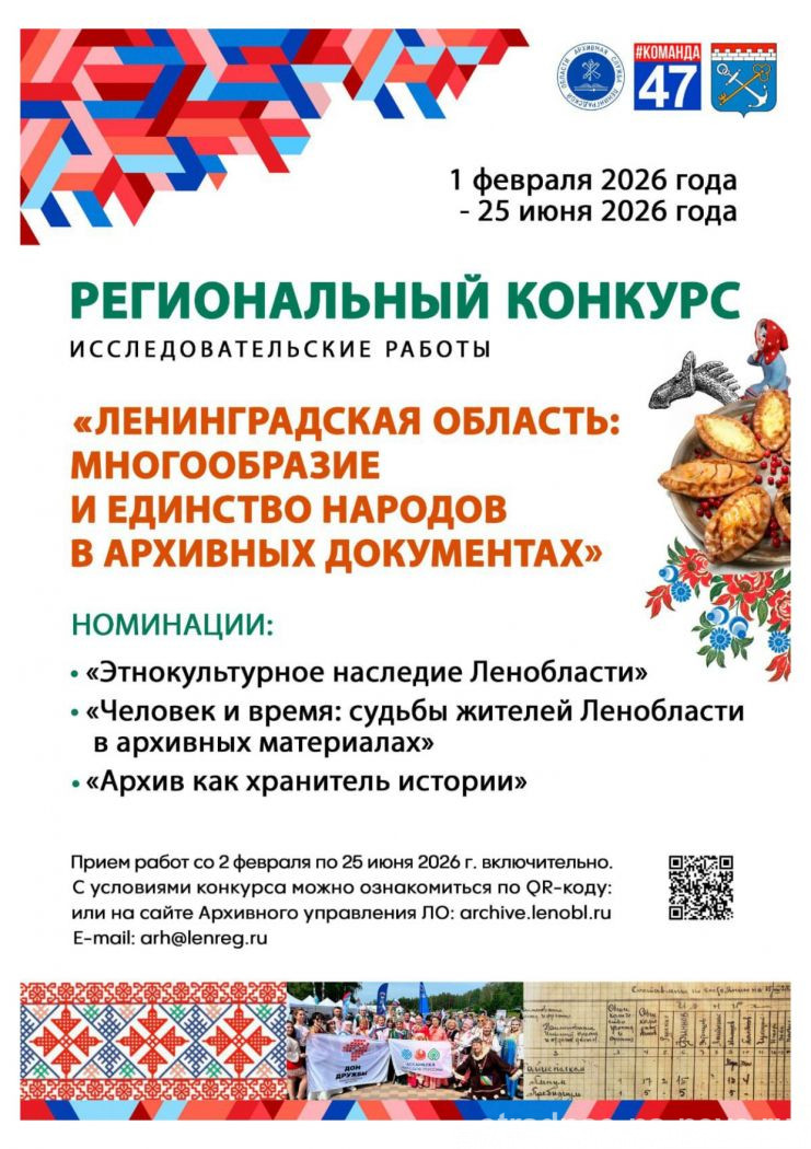 Региональный конкурс «Ленинградская область: многообразие и единство народов в архивных документах» Опубликовано 26.02.2026 12:48 Автор: Redaktor 16 Регламент Конкурса Положение о Конкурсе Эта запись была размещена в рубрике Информация Похожие статьи:Похожих статей нет. Обсуждение закрыто. « Правила сжигания мусора на дачном участке